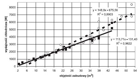 Na rysunku 1 przedstawiono zależność między maksymalną objętością nadwozia a zapotrzebowaniem wydajności chłodniczej. Widoczna dość silna zależność liniowa wskazuje, że tego typu charakterystyki mogą służyć jako proste i szybkie narzędzia ułatwiające dobór agregatu chłodniczego do konkretnego typu nadwozia.