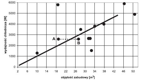 Rys. 1 Zależność między maksymalną objętością nadwozia a zapotrzebowaniem wydajności chłodniczej (według wytycznych producenta agregatów)