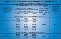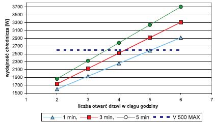 W obu środkach transportu zamontowano ten sam agregat chłodniczy. Każde z nadwozi posiada jednak inną objętość przestrzeni ładunkowej. Chcąc ilościowo ocenić zachowanie agregatu V 500 MAX w obu tych przypadkach dla każdego z nadwozi obliczono zapotrzebowanie wydajności chłodniczej dla różnych czasów otwarcia drzwi oraz różnej liczby otwarć drzwi. Wyniki przedstawiono w tabeli 2 oraz na rysunku 3.