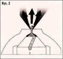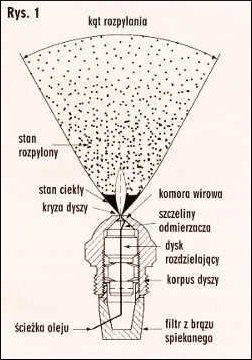 Pod wpływem wysokiego ciśnienia wywołanego przez pompę, olej przepływa przez filtr i dalej przez dolną śrubę i jej otwory boczne. Następnie płynie wzdłuż boków stalowego walca do rowków stożka, skąd wypychany jest do komory wirowej. Podczas przechodzenia przez rowki stożka cześć ciśnienia zamieniana jest na energię obrotową. W komorze wirowej olej zaczyna poruszać się ruchem obrotowym i powstaje wirująca smuga, która przesuwa się w stronę otworu dyszy. Prędkość strugi jest tak duża, że w otworze powstaje wirujący walec olejowy. Dzięki temu ciśnieniu, które nie zostało zamienione na energię obrotową walec olejowy wypychany jest przez kryzę dyszy na zewnątrz. Podczas rozpylenia oleju następuje jego rozszerzenie aż do rozpadnięcia się na drobne kropelki olejowe. Zdarzenie to obrazuje rys. 2.