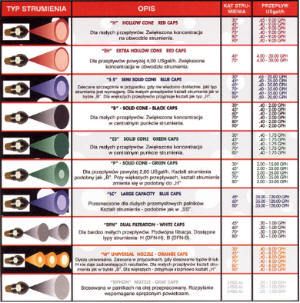 Podstawowe parametry dyszy uwzględniane podczas jej doboru to: - typ strumienia (wzorzec rozpylania) - tabela powyżej;