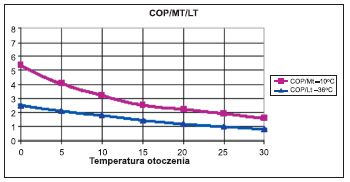 Rys. 3. Współczynniki wydajności chłodniczej dla podsystemów MT i LT w zależności od temperatury zewnętrznej