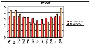 Rys. 4. Współczynniki wydajności chłodniczej dla podsystemu MT z dwutlenkiem węgla i R 404A dla różnych miesięcy w roku
