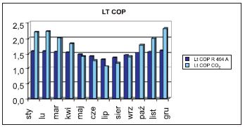 Rys. 5. Współczynniki wydajności chłodniczej dla podsystemu LT z dwutlenkiem węgla i R 404A dla różnych miesięcy w roku