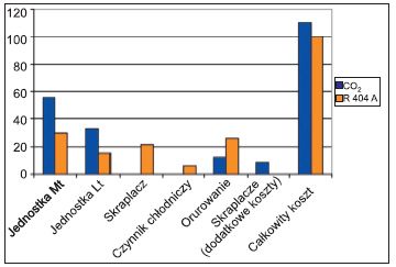 Rys. 6. Zestawienie składników wpływających na koszt instalacji chłodniczej z dwutlenkiem węgla i z R 404A