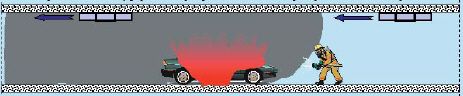1. Uzyskiwany zakres widzialności w czasie Pożaru (rys. 3). Podczas działania instalacji kanałowej następuje znaczne ograniczenie widoczności w znacznej przestrzeni garażu. Ponadto może w tym przypadku nastąpić „rozciągnięcie” dymu przez kratki wyciągowe, a więc powiększenie obszaru złej widoczności. W instalacji bezprzewodowej powierzchnia garażu ulega podziałowi na strefę „nawietrzną”, w której mamy do czynienia z silnym zadymieniem oraz na strefę „zawietrzną”, praktycznie wolną od dymu. Dzięki takiemu podziałowi możliwa jest łatwa lokalizacja pożaru i podjęcie akcji gaśniczej, ponadto przez cały czas można przeprowadzić ewakuację garażu