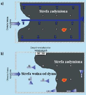 Ciekawą alternatywę dla systemu kanałowego stanowi system bezprzewodowego oddymiania garaży. Oparty jest on na pracy zespołu niewielkich wentylatorów osiowych usytuowanych w górnej części garażu oraz w strefie przebywania ludzi (rys. 1).