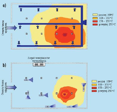 Rys. 2 Porównanie działania wentylacji kanałowej i strumieniowej – w pełni rozwinięty pożar (przy działaniu wentylacji strumieniowej)