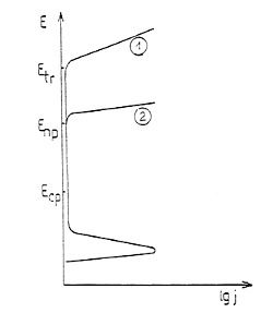Rys. 1. Wpływ korozji wżerowej na kształt krzywej polaryzacji anodowej spasywowanej stali stopowej [2]. 1 - przy braku w roztworze jonów chlorkowych 2 - w obecności jonów chlorkowych