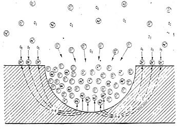 Inną cechą charakterystyczną korozji wżerowej jest autokatalityczny tzn. samo przyspieszający przebieg rozwoju zainicjowanego wżeru. Rosnący wżer stwarza warunki sprzyjające dalszemu wzrostowi szybkości roztwarzania metalu. Zjawisko to przedstawiono schematycznie na rys. 2.