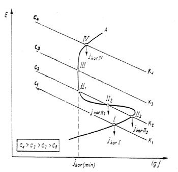 Rys. 3. Wpływ stężenia inhibitorów utleniających na korozję układu pasywującego [3] A - krzywa przebiegu procesu anodowego K1 - K4 - krzywa przebiegu reakcji katodowych przy różnych stężeniach (C1÷C4) pasywatora