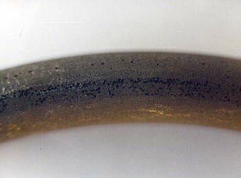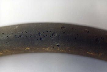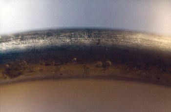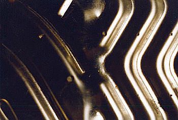 Przeprowadzone w CBW UNITEX badania makroskopowe fotograficzne wykazały bardzo dużą wżerową korozję rurek wymienników JAD 6/50 od strony wody na cele instalacji c.o. tj. po stronie zewnętrznej rurek (niskie parametry). Należy zaznaczyć że woda w instalacji nie była uzdatniana a wymienniki nigdy wcześniej nie były chemicznie oczyszczane Natomiast nie wystąpiły perforacje rurek po ich stronie wewnętrznej tzn. po stronie czynnika grzejnego ( wysokie parametry ). W niektórych wymiennikach co zależy od producentów i pewnie stosowanej technologii wytwórczej większość wżerów zlokalizowana jest wokół granicy zgrzeina - rurka. Nie zaobserwowano zupełnie wżerów na płaszczach wymienników JAD, jak też wewnątrz rurek (wysokie parametry) i to niezależnie od producenta. Płyty z wymienników ciepła dostarczone przez niektórych wytwórców wymienników płytowych korodują również, przede wszystkim na szczytach wyobleń (góra tarki), co może wskazywać, że są to miejsca stylu dwóch płyt. Na Fot.5 przedstawiono obraz płyty zaatakowanej przez korozję wżerową (lokalną) na Fot. 6 powiększony fragment płyty z Fot. 5 z wyraźnie zaznaczonymi lokalnymi ubytkami materiału w okolicach miejsca styku płyt. W miejscach tych występują ponadto naprężenia rozciągające spowodowane kształtem płyty (wyoblenie), jak i wyższym ciśnieniem po stronie wysokich parametrów. Możliwe jest wówczas tworzenie się w tych miejscach bez przepływu ogniw stężeniowych, które prowadzą do powstawania wżerów. Płyta po jednej stronie jest bardziej zaatakowana korozyjnie niż po stronie drugiej.
