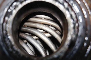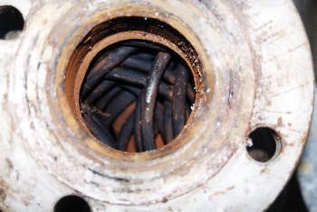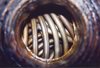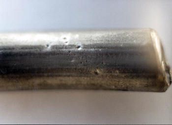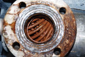- Wprowadzić aktywne pasywowanie wymienników i płyt po zakończonym zabiegu oczyszczania z osadów kamienia kotłowego i produktów korozji, tzn. czystą powierzchnię poddać aktywnej kąpieli pasywnej przez czas co najmniej 2 godzin. Na Fot.7 przedstawiono widok na rurki wymiennika JAD 6/50 przed chemicznym oczyszczaniem z widocznymi osadami hematytu 9 brązowy osad )na zewnętrznej stronie osadu i magnetytu (czarny osad ) w spodniej części osadu. Fot.8 przedstawia stan rurek po 1 godzinie chemicznego oczyszczania. Widoczny jest pozostały jeszcze magnetyt na powierzchni rurek. Po kolejnych 2 godzinach chemicznego płukania odsłania się powierzchnia rurek. Pozostawienie rurek w stanie, w którym widoczne są gołym okiem rdzawe punkty lub rdzawe zaciągnięcia powierzchni (Fot. 9 )jest dużym błędem skutkującym przyspieszoną korozją punktową w przyszłości. Należy wymiennik poddać obróbce pasywacyjnej w czystej już kąpieli preparatu o zdolnościach pasywacyjnych w czasie co najmniej 2 godzin aby uzyskać stan z Fot. 10, przez co uzyska się jej wybłyszczenie.