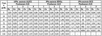 Eksperyment trwał przez 6 dni, co 24 godziny przeprowadzano pomiar stężenia Fe i Cr. Warunki pomiarów dla danego roztworu i producenta wymiennika uśredniono. Należy zaznaczyć, że wszystkie wartości odbiegały od średniej nie więcej ± 4%. Wyniki pomiarów zestawiono poniżej w Tab. 2. Tabela 2. Stężenie związków Fe i Cr w mg/dm³ w badanych roztworach kwasów w czasie ekspozycji rurek z wymienników JAD