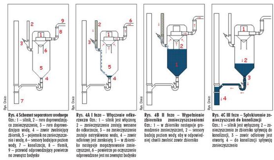 To unikalne urządzenia, działające całkowicie automatycznie i nie wymagające obsługi. Zasysane, brudne powietrze, tuż przed jednostką centralną spryskiwane jest wodą, która gromadzi się następnie w zbiorniku (rys. 4A). Znajdujący się w dolnej części zawór odlotowy jest w tym momencie zamknięty, nie dopuszczając do odpływu ścieków do kanalizacji. W zbiorniku następuje magazynowanie zanieczyszczeń (rys. 4B). Po osiągnięciu poziomu maksymalnego lub automatycznie po wyłączeniu silnika, sensory w górnej części zbiornika otwierają zawór odlotowy i opróżniają zbiornik (rys. 4C). Ten typ separatora nie wymaga stosowania dodatkowych filtrów workowych czy cyklonicznych. Dzięki zdolności odkurzania płynów może być wykorzystywany do prac mokrych, jak: pranie dywanów, usuwanie rozlanej wody z podłóg czy z zapchanych zlewów.