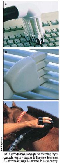 Wybór szczotek czyszczących zależy od producenta systemu. Oprócz standardowych modeli do podłóg (fot. 9), tapicerki, ubrań i grzejników znajdziemy tutaj rozwiązania niekonwencjonalne, jak np.: szczotkę do klawiatury komputera (fot. 6A), szczotkę do żaluzji (fot. 6B), szczotkę do czyszczenia sierści zwierząt (fot. 6C).