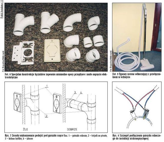 Instalacje centralnego odkurzania powinny być wykonane z materiałów zapewniających małe opory przepływu i dużą szczelność. Na łączniki i rury odkurzacza centralnego najlepiej nada się PVC. Nie należy jednak używać PVC kanalizacyjnego, gdyż nie spełnia ono wszystkich norm związanych z instalacją. Centralne odkurzanie wykonujemy z PVC o właściwościach antyelektrostatycznych i specjalnej konstrukcji łączników (fot. 8). System może być klejony, skręcany lub zaciskany obejmami z gumy.