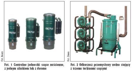 Przeznaczone są do dużych obiektów o powierzchni od 500-5000 m2. Mogą pracować w sposób ciągły do 24 h i obsługiwać jednorazowo nawet do sześciu gniazd ssących, nadają się więc doskonale do hoteli i biur. Konstrukcje trójfazowe montowane są zawsze jako wolno stojące z osobno zamocowaną turbiną ssącą. Turbiny, w zależności od konstrukcji odkurzacza, mogą być pojedyncze lub połączone w moduły (fot. 2), dzięki czemu dla tej samej jednostki centralnej znacznie wzrasta wydajność (przepływ powietrza przez odkurzacz). Odkurzacze trójfazowe wyposażane są najczęoeciej w wymienne wkłady filtracyjne lub w filtry workowe. To ostatnie rozwiązanie, w celu zminimalizowania obsługi, może mieć dodatkowo ręczne lub elektroniczne wibratory, pozwalające na strzepanie kurzu z worka bez wyjmowania go z odkurzacza.