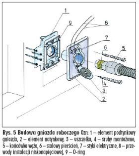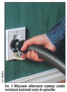 Włożenie końcówki węża do gniazda powoduje zwarcie styków (rys. 5, fot. 3), a tym samym włączenie silnika W niektórych systemach włączenie odkurzacza następuje po otwarciu gniazda ssącego. Ponowne wyjęcie oznacza jego wyłączenie. Automatyczne włączanie odkurzacza występuje tylko przy wężach z pierścieniem zwierającym pełnym. Nie jest to wygodne rozwiązanie, dlatego dostępne są też węże z pierścieniem zwierającym przeciętym, z włącznikiem umieszczonym w rączce uchwytu roboczego (fot. 9). Węże wykonywane są z giętkich, odpornych na załamanie materiałów. Mają one najczęoeciej długość 7-15 mb lub więcej. Dzięki temu, że są tak długie możliwe jest odkurzanie z jednego gniazda roboczego nawet do 80 m2 mieszkania. W domu o powierzchni 200 m2 wystarczą więc zaledwie trzy gniazda ssące.