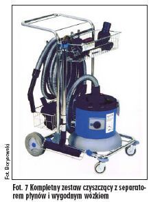 Charakter pracy instalacji centralnego odkurzania nie pozwala na przesyłanie do głównej jednostki zbieranych z podłogi płynów (za wyjątkiem odkurzaczy z separatorami wodnymi). Usuwanie rozlanych cieczy możliwe jest w sposób pośredni za pomocą separatora (fot. 7). Separator podłączony do gniazda ssącego wykorzystuje główny odkurzacz jako napęd, nie dopuszczając jednocześnie do przenikania płynów do wewnętrznej instalacji.