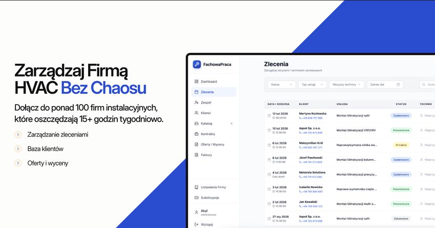 Fachowa Praca to kompletny system zarządzania zaprojektowany specjalnie dla polskich firm instalacyjnych HVAC, elektrycznych i sanitarnych z 5-20 pracownikami.