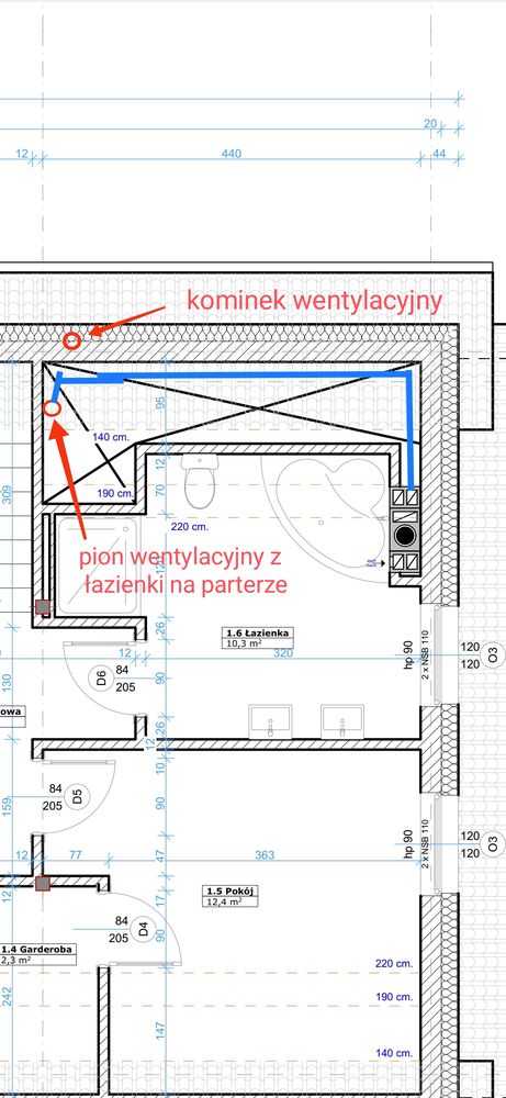 Witam serdecznie. Czy mogę tak poprowadzić wentylację z łazienki do komina murowanego wentylacyjnego jak ta niebieska linia? To jest wentylacja łazienki z parteru biegła by ona stropem w sztywnym spiro 125 i ocieplenie 5cm wełny i wpięte w komin plus do tego wentylator elektryczny, mechaniczny. Może tak być? Ewentualnie w którym miejscu dać wentylator? Oraz czy może jakiś tłumik też będzie potrzebny zawór zwrotny bądź skraplacz kondensatu?