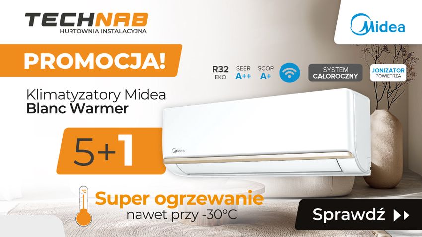Do końca czerwca 2025 roku na Technab.pl trwa wyjątkowa promocja dla instalatorów i firm z branży HVAC. Przy zakupie 5 dowolnych kompletów klimatyzatorów Midea Blanc Warmer, szósty komplet o mocy 2,6 kW otrzymasz za 1 zł!
