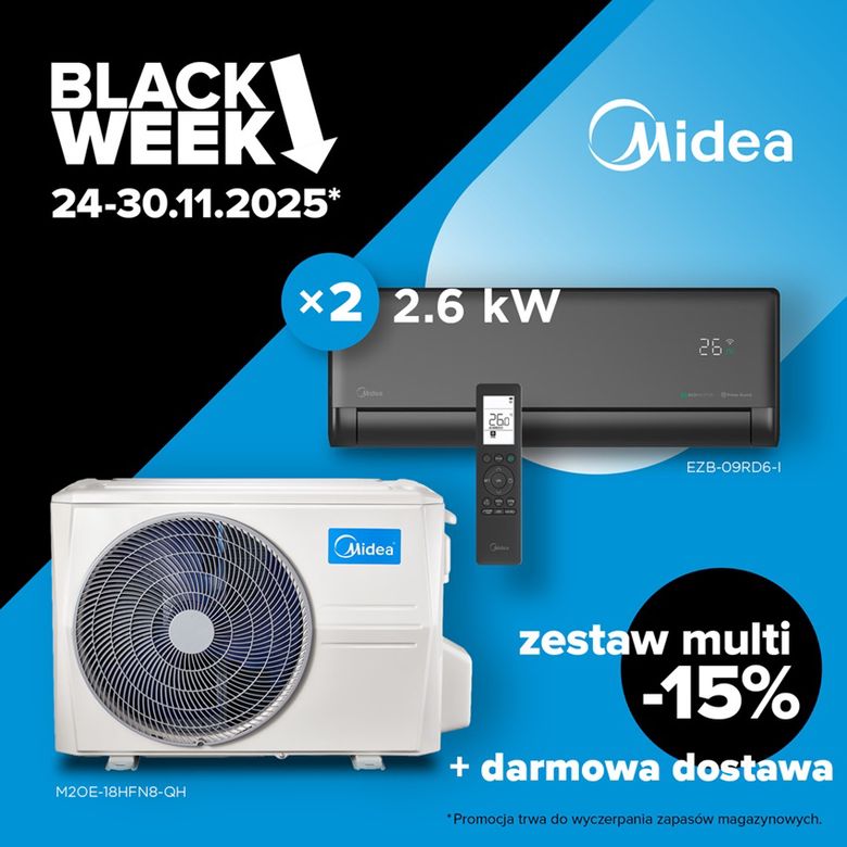 Midea ogłasza specjalną promocję z okazji Black Week, obejmującą popularny zestaw MULTI: agregat + 2 jednostki SOLSTICE DARK 2,6 kW. W dniach 24–30 listopada (lub do wyczerpania zapasów) komplet dostępny jest z 15% rabatem oraz bezpłatną dostawą.