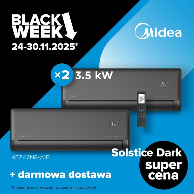 Limitowana akcja tylko na czas Black Week Midea ogłasza specjalną promocję z okazji Black Week 2025. W dniach 24-30 listopada 2025 r., lub do wyczerpania zapasów, dostępny jest pakiet obejmujący dwa komplety klimatyzatorów Midea Solstice Dark 3,5 kW (KEZ-12N8-A1B) w atrakcyjnej, obniżonej cenie.