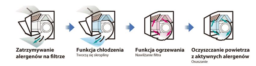 • funkcja samooczyszczania – rozpoczyna się od zatrzymania klimatyzatora i trwa do 2 godzin; jednostka jest dokładnie osuszana w środku, powodując oczyszczanie z grzybni pleśni