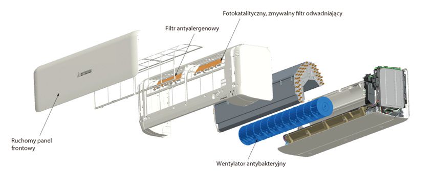 • wentylator antybakteryjny – dzięki obróbce antybakteryjnej wentylatora zahamowany jest rozwój pleśni; dlatego wnętrze klimatyzatora zawsze utrzymane jest w czystości, a urządzenie nie nawiewa zanieczyszczonego powietrza do pomieszczenia