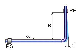 Dla prawidłowego skompensowania wydłużeń przy wykorzystaniu zmiany trasy przewodu należy zachować wymiary pokazane na rysunku. Do obliczenia odległości R można skorzystać z poniższego wzoru, do którego należy podstawić współczynniki materiałowe ujęte w tablicy. Są to typowe współczynniki, zaleca się jednak o ile możliwości na to pozwalają korzystanie z danych udostępnianych przez producentów konkretnych systemów instalacyjnych.