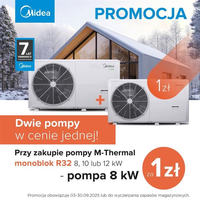 Do 30 września 2025 r. obowiązuje promocja na pompy ciepła Midea M-Thermal monoblok R32. Zakup jednego z modeli o mocy 8, 10 lub 12 kW uprawnia do nabycia dodatkowej pompy M-Thermal monoblok R32 8 kW w cenie 1 zł netto.