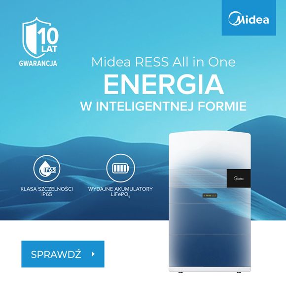 Midea RESS All in One to kompaktowy system, który łączy falownik hybrydowy, moduły bateryjne oraz moduł BMS (z ang. Battery Management System). System pozwala w pełni wykorzystać energię wytwarzaną przez instalację fotowoltaiczną co przekłada się na realne oszczędności. W przypadku przerwy w dostawie energii z sieci, system automatycznie przełącza się w tryb awaryjny, utrzymując zasilanie kluczowych odbiorników i gwarantując ciągłość pracy instalacji.