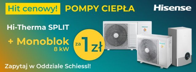 - Promocja dotyczy pomp ciepła Hisense Split 6 kW lub 8 kW, do ich zakupu dodawany jest Monoblok 8 kW w promocyjnej cenie 1 zł netto.