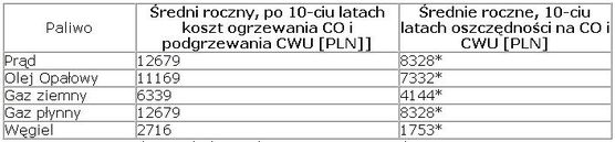 * Koszt przy sprawności kotłów: prąd 100%, olej opałowy 90%, gaz ziemny i płynny 90%, węgiel (kocioł z automatycznym podajnikiem) 80%.