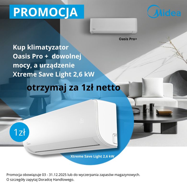 Marka Midea przygotowała wyjątkową promocję 1+1 dla wszystkich, którzy stawiają na nowoczesne i energooszczędne systemy klimatyzacyjne. Kupując wybrany model Oasis Pro+, możesz otrzymać klimatyzator Xtreme Save Light 2,6 kW w cenie 1 zł netto!