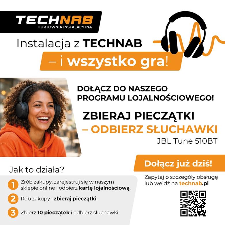 Sieć hurtowni TECHNAB wystartowała z nową akcją promocyjną dla firm instalacyjnych z branży HVAC pod hasłem „Zbieraj pieczątki - odbierz słuchawki JBL Tune 510BT”. To połączenie prostego mechanizmu lojalnościowego z realną, atrakcyjną nagrodą, które premiuje regularne zakupy i długofalową współpracę.